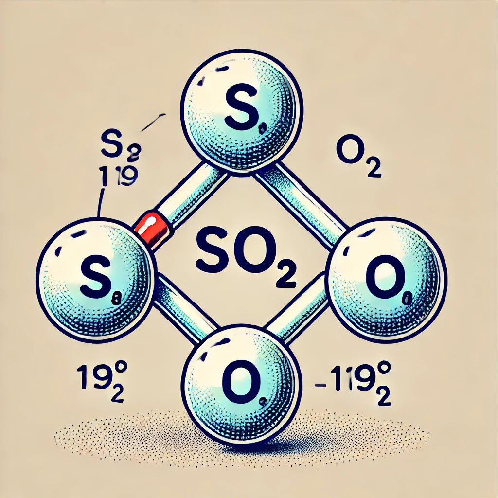 Here is the molecular structure of Sulfur Dioxide (SO₂), showing its bent shape and ~119° bond angle.