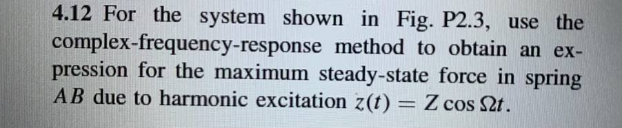 To solve for the maximum steady-state force in spring ABAB due to the harmonic excitation z(t)=Zcos(ωt)z(t) = Z \cos(\omega t) using the complex-frequency-response method, we proceed as follows: