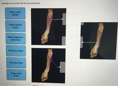 Identify the muscles that flex the wrist/hand. Flexor carpi radialis Flexor pollicis longus Flexor digitorum profundus Palmaris longus Pronator teres Flexor carpi ulnaris