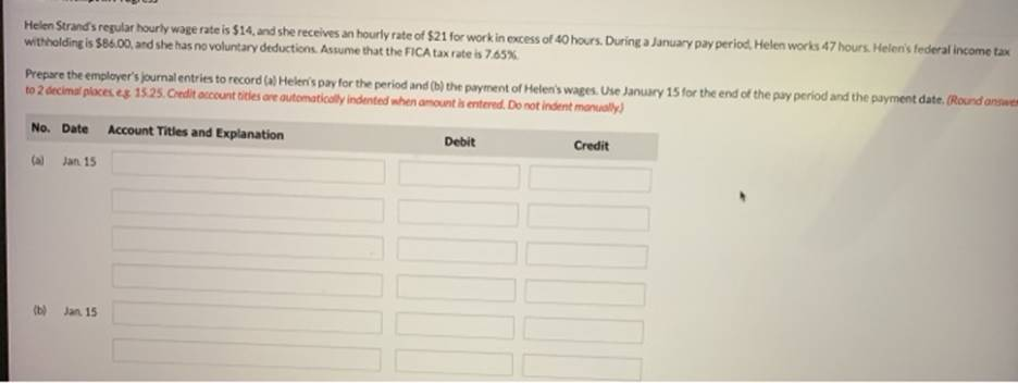 Helen Strand’s regular hourly wage rate is $14, and she receives an hourly rate of $21 for work in excess of 40 hours. During a January pay period Helen works 47 hours. Helen’s federal income tax withholding is $86.00, and she has no voluntary deductions. Assume that the FICA tax rate is 7.65%. Prepare the employer’s journal entries to record (al Heler’s pay for the period and (b) the payment of Helen’s wages. Use January 15 for the end of the pay period and the payment date. (Round answer to 2 decimal places. e.8. 15.25. Credit account titles are automatically indented when amount is entered. Do not indent manually) No. Date Account Titles and Explanation Debit Credit Jan 15 Jan 15
