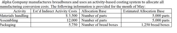 Alpha Company manufactures breadboxes and uses an activity-based costing system to allocate all manufacturing conversion costs. The following information is provided for the month of May: Activity Estd Indirect Activity Costs Allocation Base | Estimated Allocation Base Materials handling $ 3,500 Number of parts 5,000 parts Assembling 12,000 Number of parts 5,000 parts Packaging 5,750 | Number of bread boxes 1,250 bread boxes