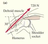 The deltoid—the rounded muscle across the top of your upper arm—allows you to lift your arm away from your side. It does so by pulling on an attachment point on the humerus, the upper arm bone, at an angle of 15° with respect to the humerus. If you hold your arm at an angle 30° below horizontal, the deltoid must pull with a force of 720 N to support the weight of your arm, as shown in FIGURE 3.21a. (You’ll learn in Chapter 5 that force is a vector