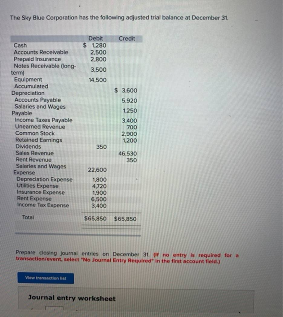 The Sky Blue Corporation has the following adjusted trial balance at December 31. Credit Debit $ 1,280 2,500 2,800 3,500 14,500 $ 3,600 5,920 1,250 Cash Accounts Receivable Prepaid Insurance Notes Receivable (long- term) Equipment Accumulated Depreciation Accounts Payable Salaries and Wages Payable Income Taxes Payable Unearned Revenue Common Stock Retained Earnings Dividends Sales Revenue Rent Revenue Salaries and Wages Expense Depreciation Expense Utilities Expense Insurance Expense Rent Expense Income Tax Expense 3,400 700 2,900 1,200 350 46,530 350 22,600 1,800 4,720 1,900 6,500 3,400 Total $65,850 $65,850 Prepare closing Journal entries on December 31. (If no entry is required for a transaction/event, select “No Journal Entry Required” in the first account field.) View transaction list Journal entry worksheet
