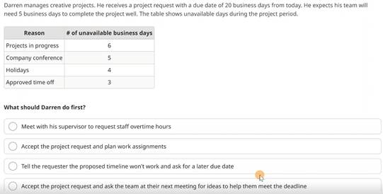 Darren manages creative projects. He receives a project request with a due date of 20 business days from today. He expects his team will need 5 business days to complete the project well. The table shows unavailable days during the project period. What should Darren do first? Meet with his supervisor to request staff overtime hours Accept the project request and plan work assignments Tell the requester the proposed timeline won’t work and ask for a later due date Sam is an IT manager. A new process requires staff to log off their computers at the end of their shift so software can update. Some staff are turning the computers off instead, leaving several computers without critical updates. As a result, Sam has to deal with help requests that take him away from other duties. What should Sam do? Select all that apply. Send out an email every evening reminding staff to log out but not turn off their computers Let team supervisors know which team members aren’t following the process Stay after his shift to make sure all the computers are on Ask team supervisors to enlilire each team member understands the importance of the new process Tell the staff who aren’t following the process that they’ll be written up