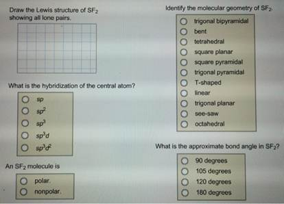 - The Lewis structure of SF₂ has sulfur in the center, bonded to two fluorine atoms. Each fluorine has three lone pairs, and sulfur has two lone pairs.
