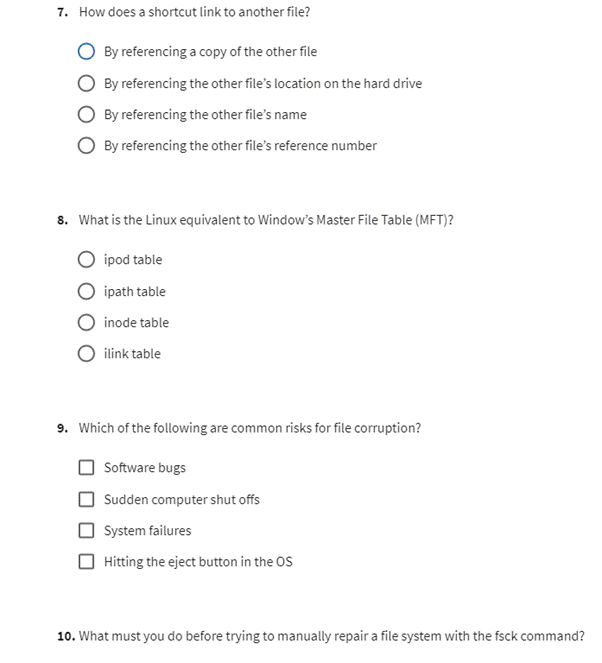 How does a shortcut link to another file? By referencing a copy of the other file By referencing the other file’s location on the hard drive By referencing the other file’s name By referencing the other file’s reference number 8. What is the Linux equivalent to Window’s Master File Table (MFT)? ipod table ipath table inode table ilink table 9. Which of the following are common risks for file corruption? Software bugs Sudden computer shut offs System failures Hitting the eject button in the OS 10. What must you do before trying to manually repair a file system with the fsck command?\r\n10. What must you do before trying to manually repair a file system with the fsck command? Make sure the file system is properly unmounted. Reboot your computer. Run the chkdsk command. Make sure the file system is properly mounted.
