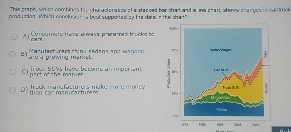 This graph, which combines the characteristics of a stacked bar chart and a line chart, shows changes in car/truck production. Which conclusion is best supported by the data in the chart? A) Consumers have always preferred trucks to cars. B) Manufacturers think sedans and wagons are a growing market. C) Truck SUVs have become an important part of the market. D) Truck manufacturers make more money than car manufacturers.