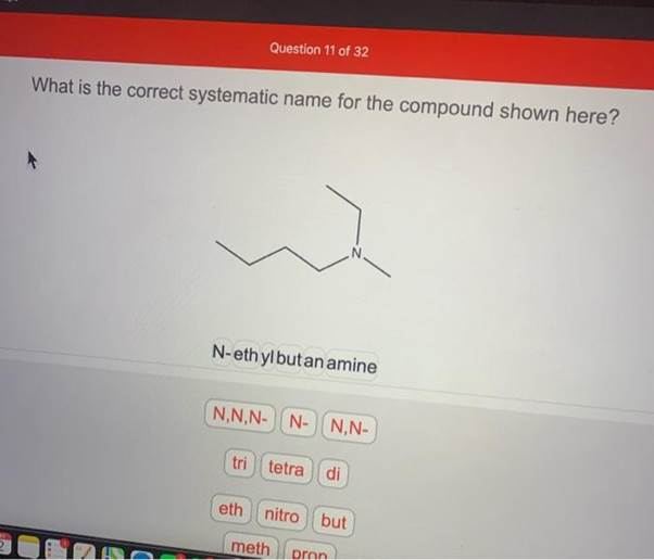 What is the correct systematic name for the compound shown here? N N-ethylbutan amine N,N,N- N- N,N- tri tetra di eth nitro but meth pron