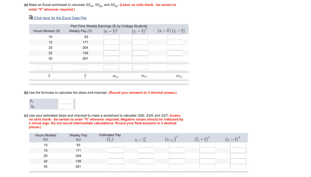(a) Make an Excel worksheet to calculate SSxx SSyy, and SSxy. (Leave no cells blank – be certain to enter “0” wherever required.) Click here for the Excel Data File (x1 – 7) (y; -7) Hours Worked (X) 10 15 Part-Time Weekly Earnings (S) by College Students Weekly Pay (Y) (x; – )2 (); -7) 93 171 204 156 261 20 20 35 12 SS. SSyy SS.xy (b) Use the formulas to