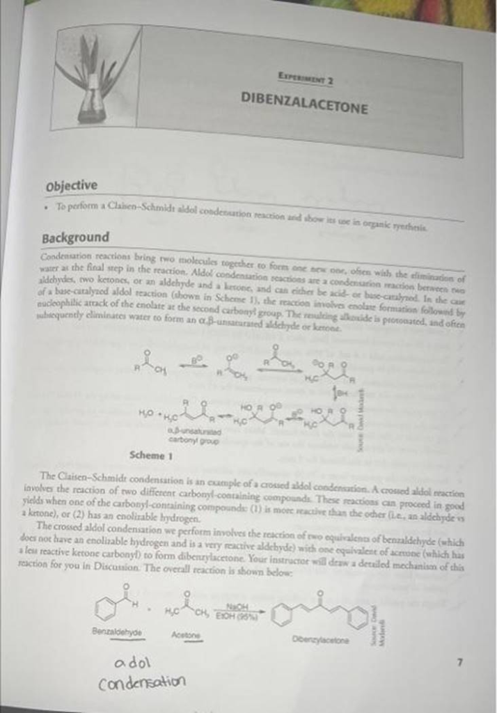 [ 2 \, \text{C}_6\text{H}_5\text{CHO} + \text{CH}_3\text{COCH}_3 \rightarrow \text{C}_6\text{H}_5\text{CH}=\text{CH}\text{COCH}=\text{CH}\text{C}_6\text{H}_5 ]