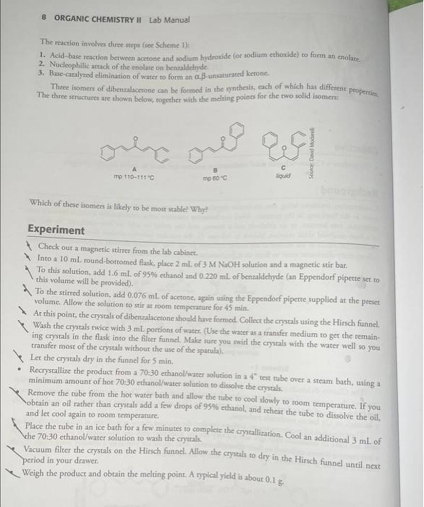 In this experiment, benzaldehyde is the limiting reagent, and the theoretical yield of dibenzalacetone is approximately 0.905 g. The actual yield obtained is 0.150 g, resulting in a percent yield of about 16.6%. This relatively low yield may be attributed to factors such as incomplete reactions, losses during product isolation, or impurities in the reagents.