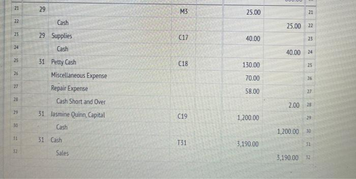 Transactions: Aug 29 29 31 Received bank statement showing August bank service charge $25.00 M3. Paid cash for supplies, $40.00. C17. Paid cash to replenish the petty cash fund, $13000: miscellaneous expense, $70.00; repairs, $58.00, cash short, $2.00. C18 Paid cash to owner as a withdrawal of equity, $1,200.00.019. Received cash from sales, $3,190.00. T31. 31 31 21 29 M3 25.00 21 22 Cash 25.00 22 25 (17 40.00 23 24 40.00 24 25 C18 130.00 25 26 29 Supplies Cash 31 Petty Cash Miscellaneous Expense Repair Expense Cash Short and Over 31 Jasmine Quinn, Capital Cash 70.00 26 21 58.00 27 28 2.00 25 29 C19 1,200.00 29 50 1,200.00 30 31 31 Cash T31 3.190.00 51 Sales 3.190.0022
