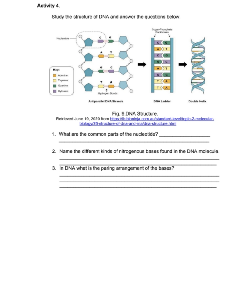 What are the common parts of the nucleotide? 2. Name the different kinds of nitrogenous bases found in the DNA molecule. 3. In DNA what is the paring arrangement of the bases?