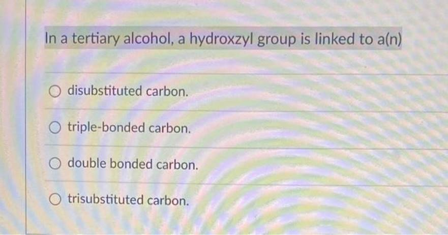 The correct answer for the type of carbon that a hydroxyl group is attached to in a tertiary alcohol is trisubstituted carbon, as it is a carbon that is bonded to three other carbon atoms.