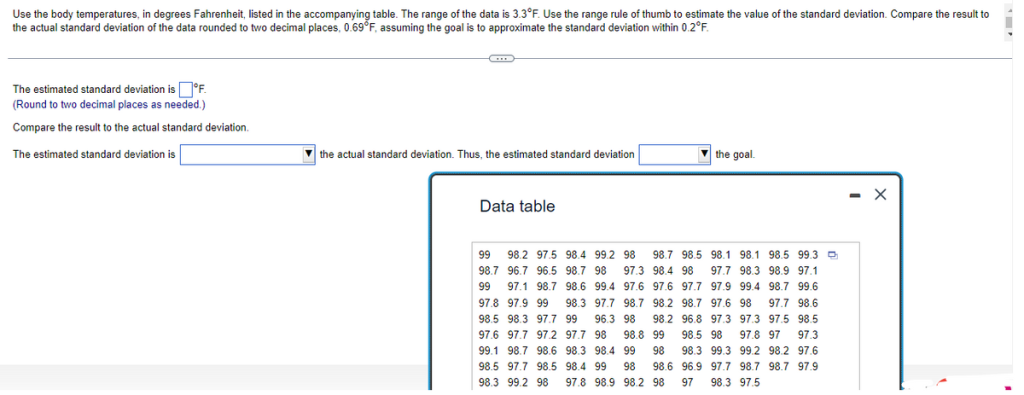 Use the body temperatures, in degrees Fahrenheit, listed in the accompanying table. The range of the data is 3.3°F. Use the range rule of thumb to estimate the value of the standard deviation. Compare the result to the actual standard deviation of the data rounded to two decimal places, 0.69°F, assuming the goal is to approximate the standard deviation within 0.2°F