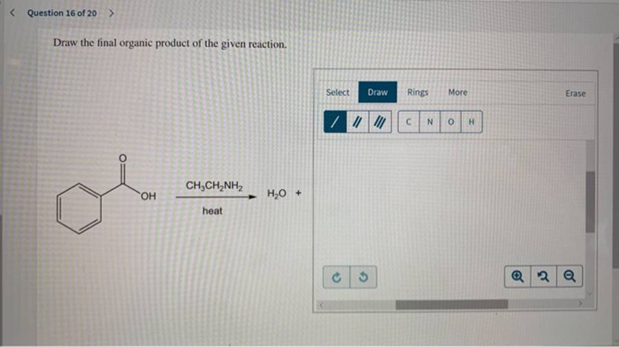 Draw the final organic product of the given reaction. Select Draw Rings More Erase CH3CH2NH2 H,O + heat Question 12 of 20 > Draw the product or products of the reaction. Include charges where appropriate. Draw the product(s). Draw condensed hydrogens. Select Draw Rings More Erase CH3 + HCI H3C CH NH2 Reaction B Select Draw Rings More Erase (CH4)2CHCHCOOH + CH-CH(CH, NH heat 2 | H?c Reaction C Question 18 of 20 > Draw the remaining product of the reaction. Draw the remaining product of the reaction. Select Draw Rings More OHN CCI + 2 HTC–CH, NH } +H,C-CH-NH, C17 about us Careers privacy policy Terms of use contact us help 11:30 AM Draw the products of the reaction. Draw the products. Be sure to add hydrogens to heteroatoms, where needed. Select Draw Rings More Erase NH3