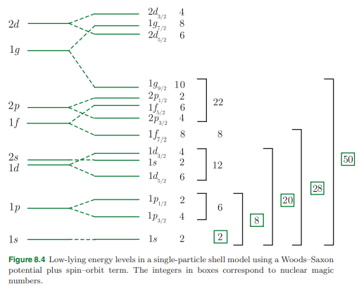 - In the nuclear shell model, nucleons fill energy levels in the sequence ( 1s_{1/2}, 1p_{3/2}, 1p_{1/2}, \dots ), following the Pauli exclusion principle and spin-orbit coupling.