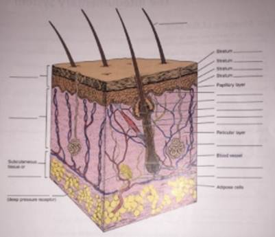- layer of areolar connective tissue 88 Review Sheet 6 4. Label the skin structures and areas indicated in the accompanying diagram of thin skin. Then areas indicated in the accompanying diagram of thin skin. Then, complete the statements that follow. same Sratum Sratum Sratum. Papillary layer Reticular layer Blood vessel issue or Adipose cels (deep pressure receptor) a.granules contain glycolipids that prevent water loss from the skin. b. Fibers in the dermis are produced by