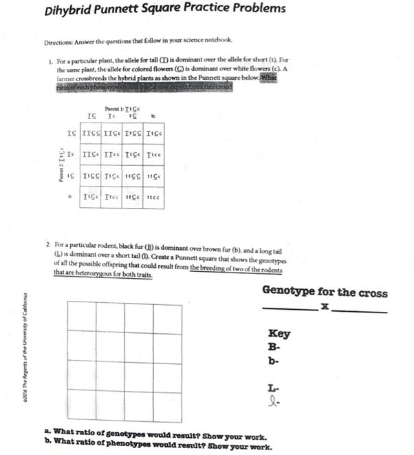 Dihybrid Punnett Square Practice Problems Directions: Answer the questions that follow in your science notebook. For a particular plant, the allele for tall (T) is dominant over the allele for short (t). For the same plant, the allele for colored flowers (G is dominant over white flowers (c). A farmer as shown in the Punnett