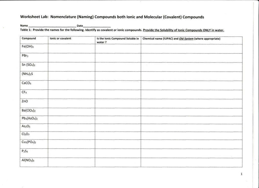 Nomenclature (Naming) Compounds both lonic and Molecular (Covalent) Compounds Name Date_ Table 1: Provide the names for the following. Identify as covalent or ionic compounds. Provide the Solubility of lonic Compounds ONLY in water. Compound Fe(OH)3 PBr3 Sn (SO4)2 (NH4)2S CaCO3 CF4 ZnO Ba(ClO4)2 Pb3(ASO4)2 Asâ‚‚O5 Clâ‚‚O7 Cu3(PO4)2 Pâ‚‚S3 AI(NO3)3 lonic or covalent Is the lonic Compound Soluble in Chemical name (IUPAC) and Old System (where appropriate) water? 1