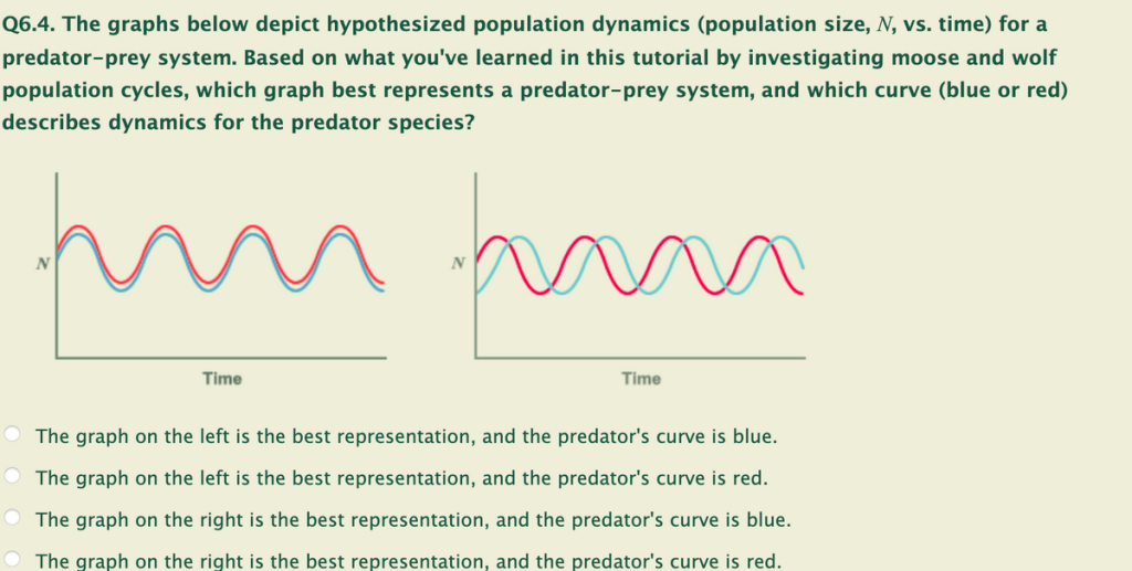 The graphs below depict hypothesized population dynamics (population size, N, vs. time) for a predator-prey system. Based on what you’ve learned in this tutorial by investigating moose and wolf population cycles, which graph best represents a predator-prey system, and which curve (blue or red) describes dynamics for the predator species? Time Time The graph on the left is the best representation, the predator’s curve is blue. The graph on the left is the best representation, and the predator’s curve is red. The graph on the right is the best representation, and the predator’s curve is blue. The graph on the right is the best representation, and the predator’s curve is red.