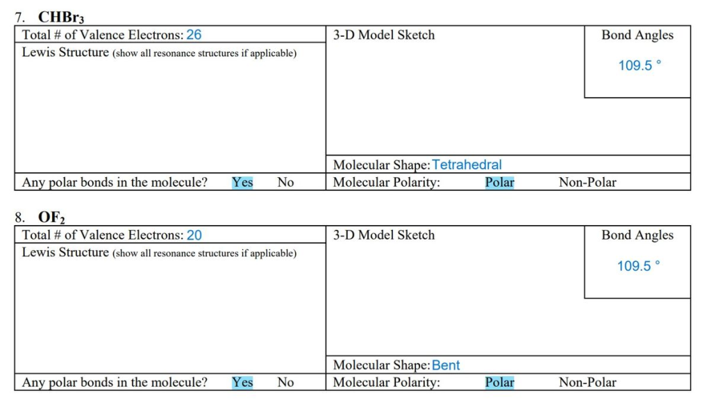 CHBr3 Total # of Valence Electrons: 26 Lewis Structure (show all resonance structures if applicable) Any polar bonds in the molecule? Yes No 8. OF2 Total # of Valence Electrons: 20 Lewis Structure (show all resonance structures if applicable) Any polar bonds in the molecule? Yes No 3-D Model Sketch Molecular Shape: Tetrahedral Molecular Polarity: 3-D Model Sketch Molecular Shape: Bent Molecular Polarity: Polar Polar Bond Angles Non-Polar 109.5° Bond Angles 109.5° Non-Polar