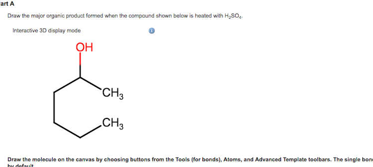 Draw the major organic product formed when the compound shown below is heated with H2SO4. Interactive 3D display mode OH CH CH Draw the molecule on the canvas by choosing buttons from the Tools (for bonds), Atoms, and Advanced Template toolbars. The single bon