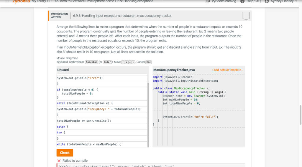 ZyBooks My library > 11_ 145. Intro to Software Development home > 6.9: Handling exceptions PARTICIPATION ACTIVITY 6.9.5: Handling input exceptions: restaurant max occupancy tracker. Arrange the following lines to make a program that determines when the number of people in a restaurant equals or exceeds 10 occupants. The program continually gets the number of people entering or leaving the restaurant. Ex: 2 means two people entered, and -3 means three people left. After each input, the program outputs the number of people in the restaurant. Once the number of people in the restaurant equals or exceeds 10, the program exits. If an InputMismatchException exception occurs, the program should get and discard a single string from input. Ex: The input “2 abc 8” should result in 10 occupants. Not all lines are used in the solution. Mouse: Drag/drop Keyboard: Grab/release Spacebar (or Enter). Move +00D Cancel Esc Unused System.out.println(“Error”); } if (totalNumPeople < 0)=”” {=”” totalnumpeople=”0;” }=”” catch=”” (inputmismatchexception=”” e)=”” {=”” system.out.println(“occupancy:=”” “=”” +=”” totalnumpeople);=”” }=”” totalnumpeople=”” +=”” scnr.nextint=”” ();=”” catch=”” {=”” try=”” {=”” }=”” while=”” (totalnumpeople=””>< maxnumpeople)=”” {=”” maxoccupancy=”” tracker.java=”” e=”” zybooks=”” catalog=”” import=”” java.util.scanner;=”” import=”” java.util.=”” inputmismatchexception;=”” }=”” load=”” default=”” template…=”” public=”” class=”” maxoccupancytracker=”” {=”” public=”” static=”” void=”” main=”” (string[]=”” args)=”” {=”” scanner=”” scnr=”new” scanner(system.in);=”” int=”” maxnumpeople=”10;” int=”” totalnumpeople=”0;” check=”” x=”” failed=”” to=”” compile=”” maxoccupancytracker=”” java:17:=”” error:=”” ‘catch’=”” without=”” ‘try!=”” system.out.println(“we’re=”” full!”);=”” help/faq=”” sydney=””>