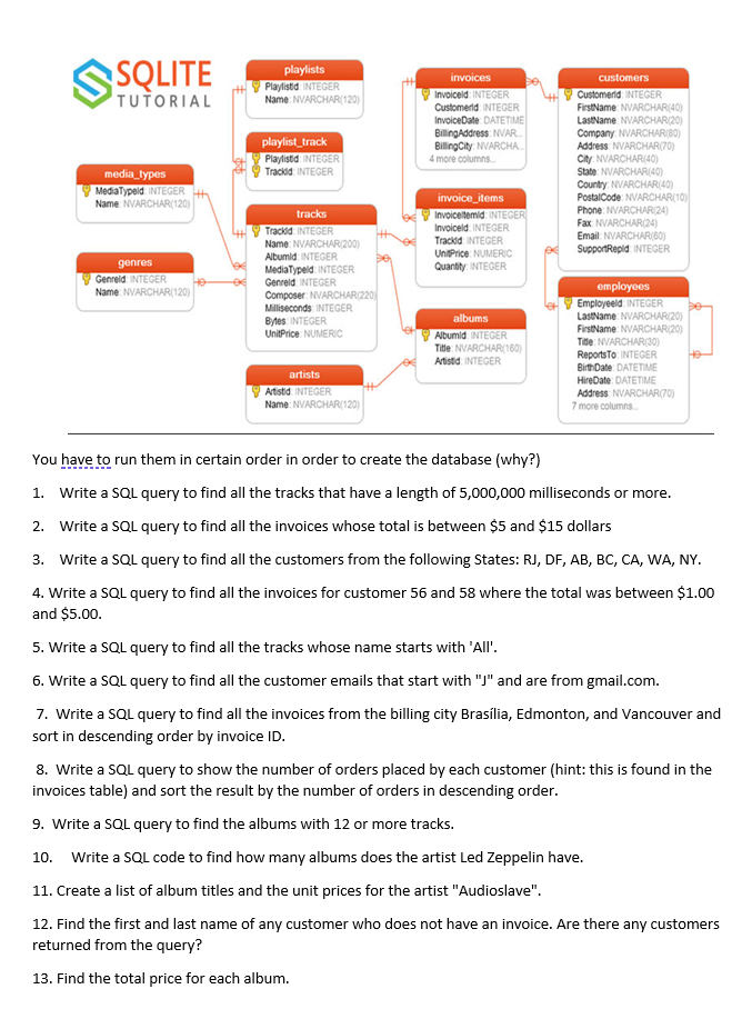 Write a SQL query to find all the invoices for customer 56 and 58 where the total was between $1.00 and $5.00. 5. Write a SQL query to find all the tracks whose name starts with ‘All’. 6. Write a SQL query to find all the customer emails that start with “J” and are from gmail.com. 7. Write a SQL query to find all the invoices from the billing city Brasília, Edmonton, and Vancouver and sort in descending order by invoice ID. 8. Write a SQL query to show the number of orders placed by each customer (hint: this is found in the invoices table) and sort the result by the number of orders in descending order. 9. Write a SQL query to find the albums with 12 or more tracks.