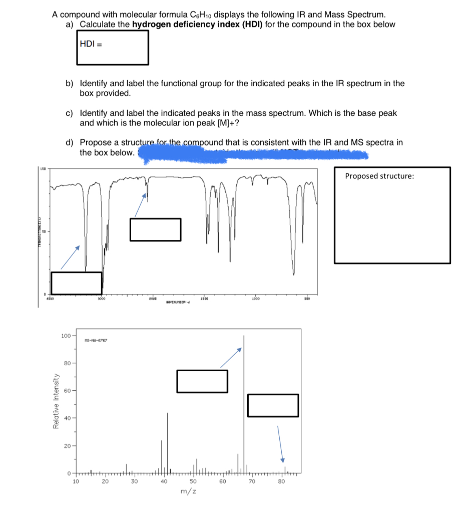 A compound with molecular formula C6H10 displays the following IR and Mass Spectrum. a) Calculate the hydrogen deficiency index (HDI) for the compound in the box below HDI = b) Identify and label the functional group for the indicated peaks in the IR spectrum in the box provided. c) Identify and label the indicated peaks in the mass spectrum. Which is the base peak and which is the molecular ion peak [M]+? d) Propose a structure for the compound that is consistent with the IR and MS spectra in the box below.