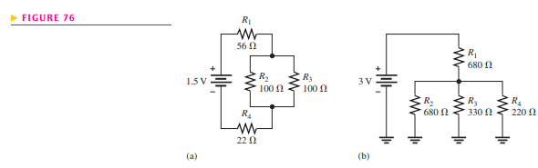 Determine the current through each resistor in both circuits of Figure 76; then calculate each voltage drop.