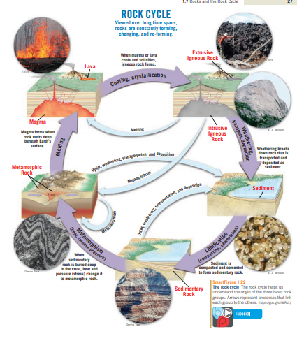 The rock cycle diagram illustrates how Earth’s materials transform between three primary rock types: igneous, metamorphic, and sedimentary. The arrows in the diagram represent processes such as weathering, erosion, deposition, compaction, cementation, melting, cooling, and metamorphism. These arrows and processes explain why sedimentary rocks are the most abundant rock type on Earth’s surface.