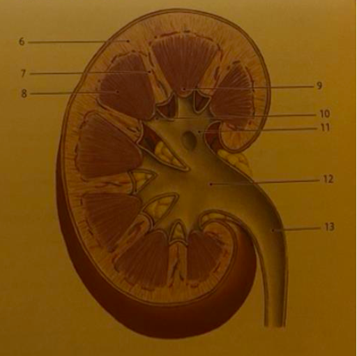 Match the labeled structure in the diagram with the appropriate description. a. The base of this structure borders the renal cortex. b. Proximal and distal convoluted tubules are located in this region. c. This structure transports urine to the urinary bladder. d. Papillary ducts drain into this structure. e. This structure is an inward extension of the renal cortex. f. Major calyces drain urine directly into this structure. &This structure forms the apex of a renal pyramid h. Several minor calyces merge to form this structure