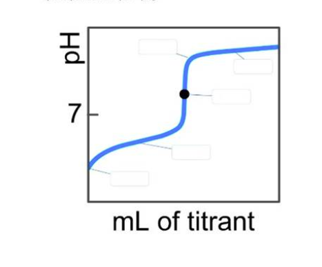On the weak acid/strong base titration curve below, label the following points. a) The point where the pH corresponds to a solution of the weak acid (HA) in water. b) The point where the pH corresponds to a solution of the conjugate base (A) in water. c) The point where pH = pK.