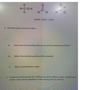H-C-0-H o H3COH > HCO2-> H2CO 3. Draw the Lewis structure for Xe5+. a) How many of non-bonding electrons are on the central atom of XeF5+? b) What is the molecular geometry of this molecule? c) What is the hybridization of Xe? 4. A molecule with the formula AB3 could have one of four different shapes. Give the steric number, shape and the hybridization of the central A atom for each four