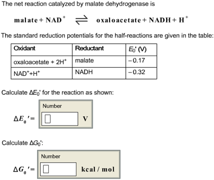 The net reaction catalyzed by malate dehydrogenase is malate + NAD+ oxaloacetate + NADH + H + The standard reduction potentials for the half-reactions are given in the table: Calculate Delta E0′ for the reaction as shown: Delta E0′ = V Calculate Delta G0′: Delta G0 = kcal / mol