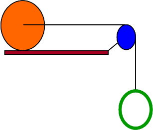 An green hoop with mass mh = 2.4 kg and radius R = 0.14 m hangs from a string that goes over a blue solid disk pulley with mass md = 2.3 kg and radius Rd= 0.08 m. The other end of the string is attached to a massless axel through the center of an orange sphere on a flat horizontal surface that rolls without slipping and has mass ms = 3.7 kg and radius Rs = 0.23 m. The system is released from rest.