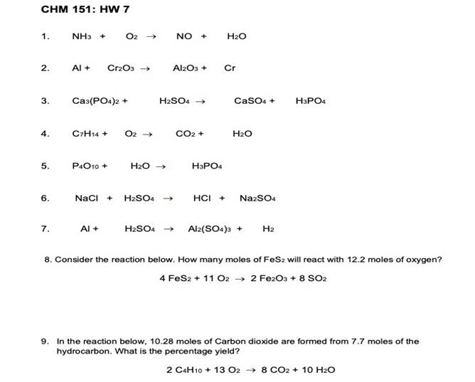 CHM 151: HW 7 1. NH O2 NO H₂O 2. Al+ Cr2O3 Al2O3+ Cr 3. Ca3(PO4)2 + H2SO4 CaSO+ H3PO4 4. C7H14+ O2 CO2 + H2O 5. P4O10+ H₂O H3PO4 6. NaCl + H2SO4 HCI Na2SO4 7. Al+ H2SO4 Al2(SO4)3 H 8. Consider the reaction below. How many moles of FeS: will react with 12.2 moles of oxygen? 4 FeS2 + 11 02 2 Fe2O3 + 8 SO2 9. In the reaction below, 10.28 moles of Carbon dioxide are formed from 7.7 moles of the hydrocarbon. What is the percentage yield? 2 C4H10 13 028 CO2 10 H₂O