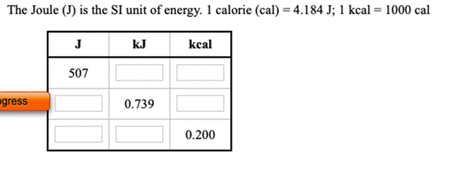 The Joule (J) Is The SI Unit Of Energy. 1 Calorie (Cal) = 4.184 J J Cal KJ 558 109 0.492 The Joule (J) Is The SI Unit Of Energy. 1 Calorie (Cal) = 4.184 J; 1 Kcal = 1000 Cal J KJ Kcal 507 Egress 0.739 0.200 A List Of The Calorie Content Of Foods Indicates That A Piece Of Lemon Meringue Pie Contains 319 Calories. Express This Value In KJ And In J. The
