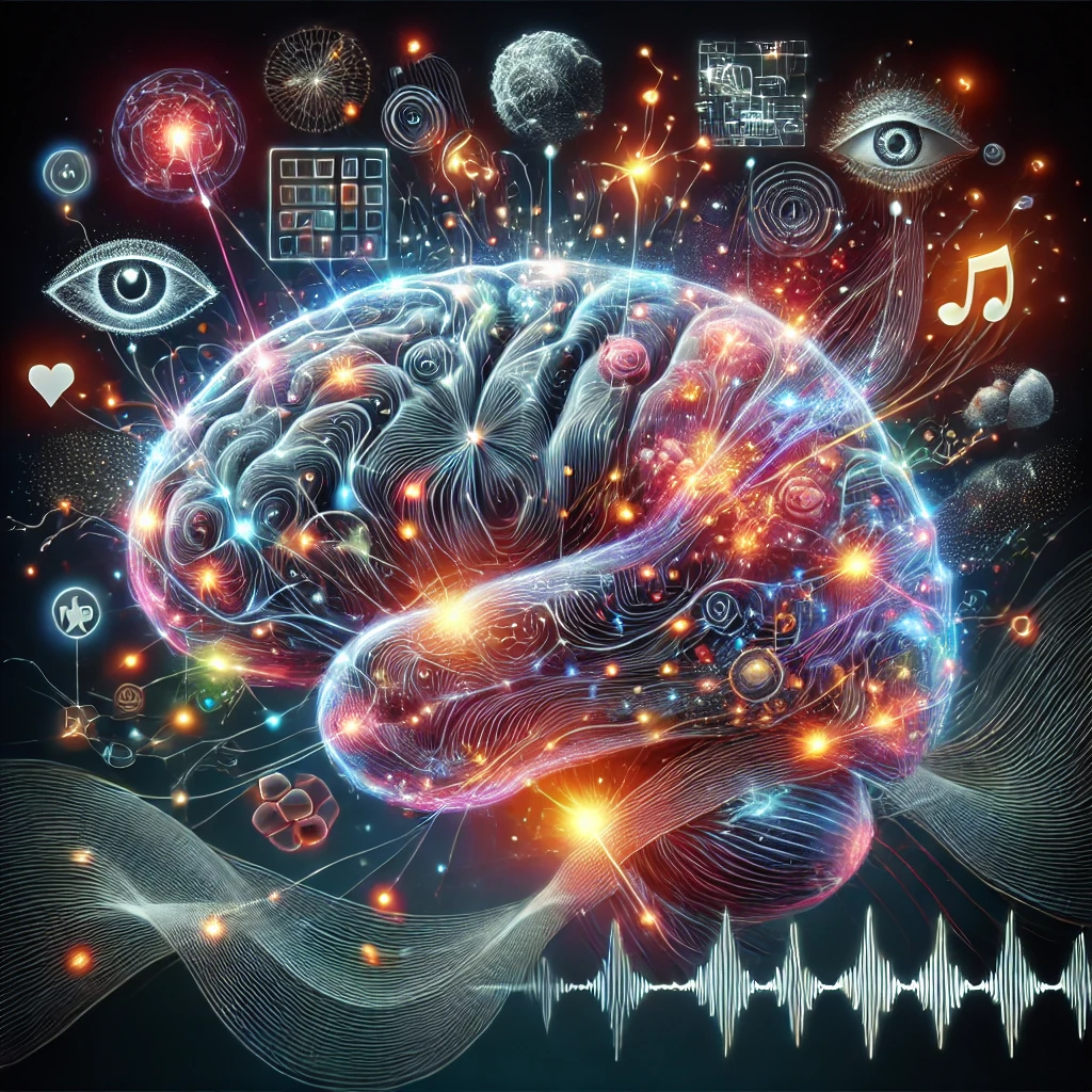 Here is a conceptual image that visualizes the activation-synthesis model of dreaming. It shows the brain during REM sleep, with electrical signals firing and synthesizing random memories, emotions, and sensations into a dream. The dynamic activity in the brain, represented by glowing connections and abstract symbols, reflects how the brain tries to make sense of random neural activity.