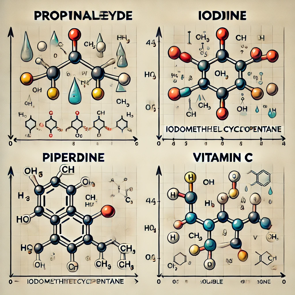 Here is the visual representation of the molecular structures of propionaldehyde, iodomethylcyclopentane, piperidine, and vitamin C, along with indications of their polarity and solubility trends in water versus hexane. The image highlights the key functional groups in each compound and their interactions with the solvents. Let me know if you’d like further clarification or adjustments!