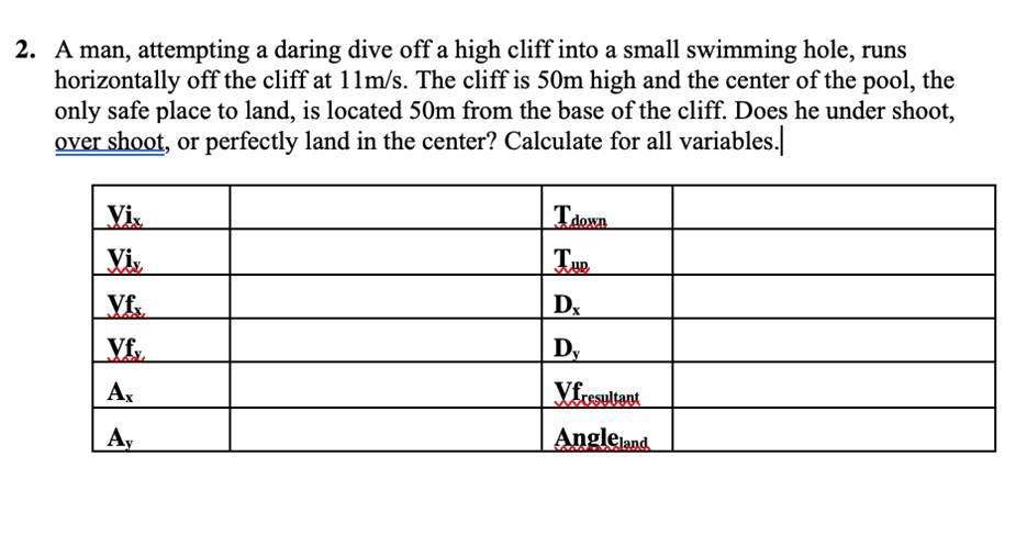 A man, attempting a daring dive off a high cliff into a small swimming hole, runs horizontally off the cliff at 11m/s. The cliff is 50m high and the center of the pool, the only safe place to land, is located 50m from the base of the cliff. Does he under shoot, over shoot, or perfectly land in the center? Calculate for all variables. Tdown DE D, V cesultat Angleland