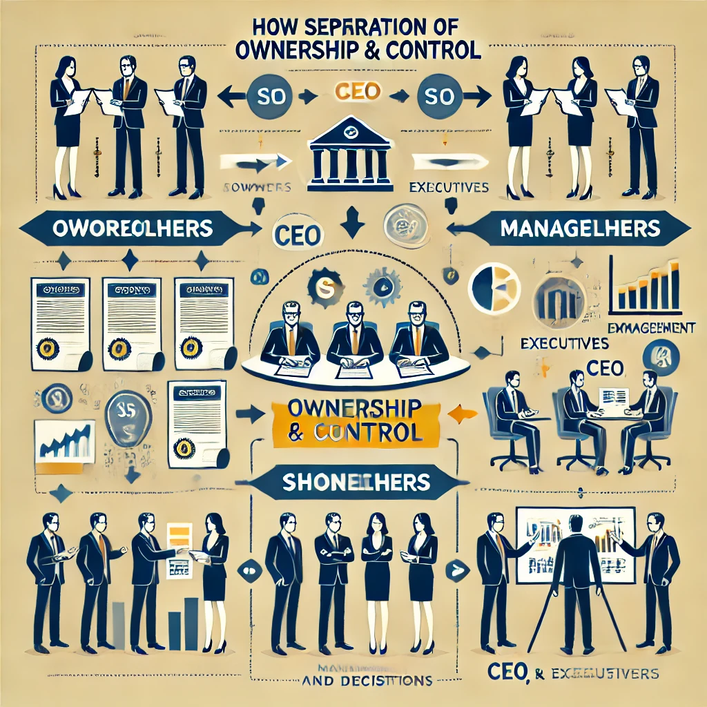 Here is an infographic illustrating the structure of a corporation, showing the separation of ownership and control. It highlights the roles of shareholders (owners) and management (CEO, executives) and the flow of decisions and information between them. This visual representation aligns with the concept of separation between ownership and control in a corporation.