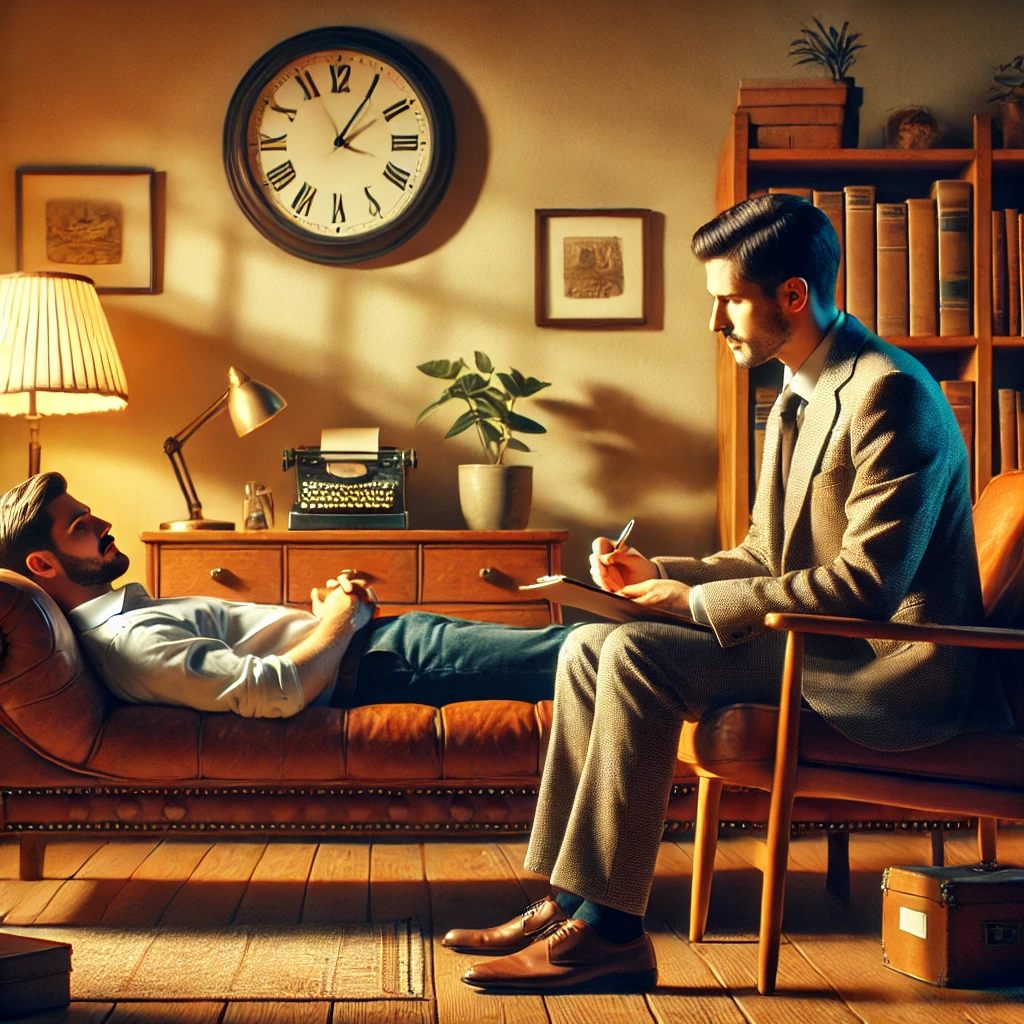 I’ve provided an image depicting a traditional psychoanalysis session, with a patient lying on a couch and a therapist attentively taking notes in a warm, professional setting. Let me know if you need any modifications or further assistance!