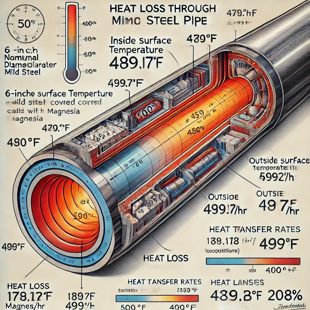 A 6-inch nominal diameter mild steel pipe (I.D.= 6.065 inch ; O.D.=6.625 inch) has an inside-surface temperature of 500°F. The pipe is covered with a 2-inch layer of 85% magnesia insulation which has a surface temperature of 200°F.