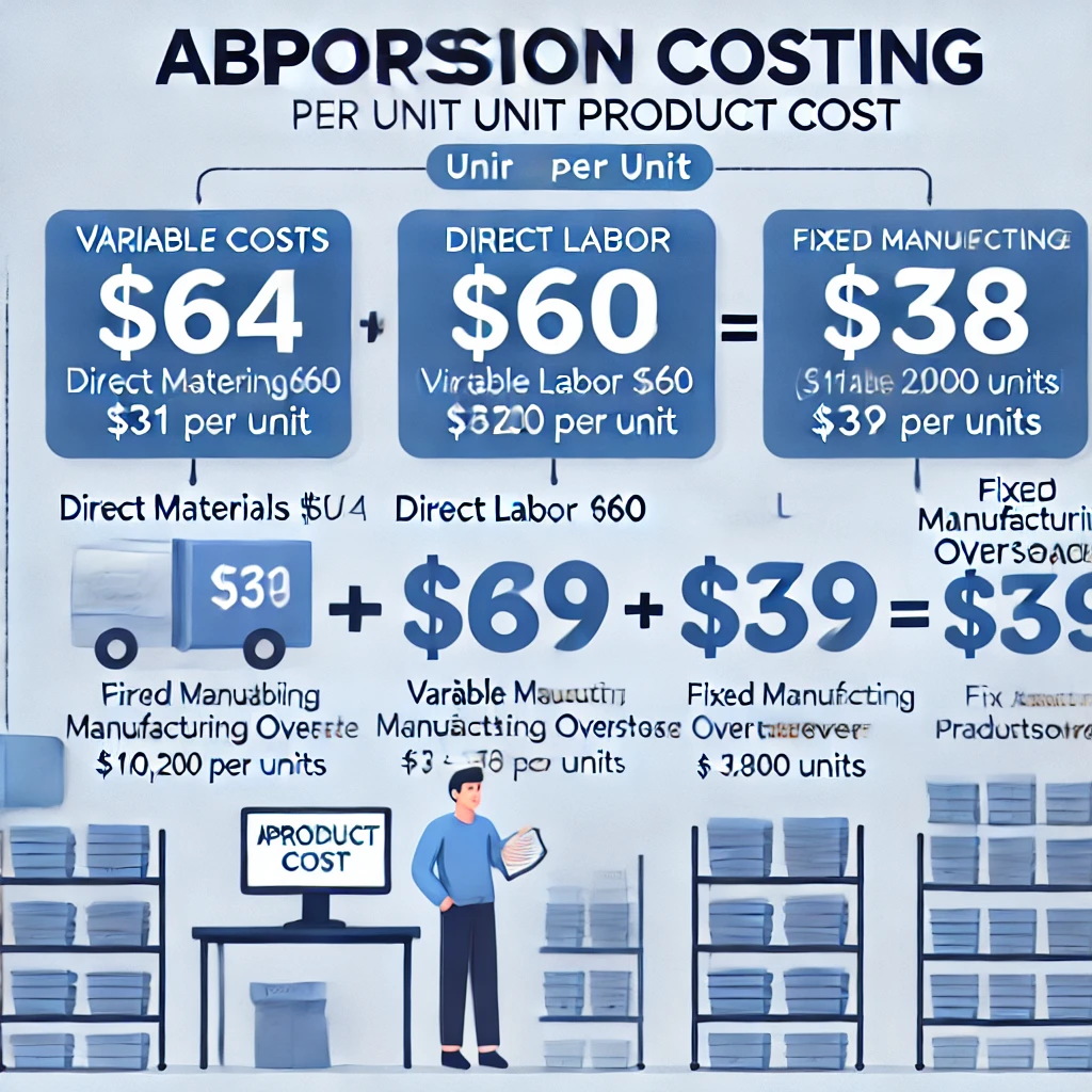 Here is the visual breakdown of the absorption costing unit product cost calculation. It illustrates the process of adding variable and fixed manufacturing costs to arrive at the final absorption costing unit product cost of $169.
