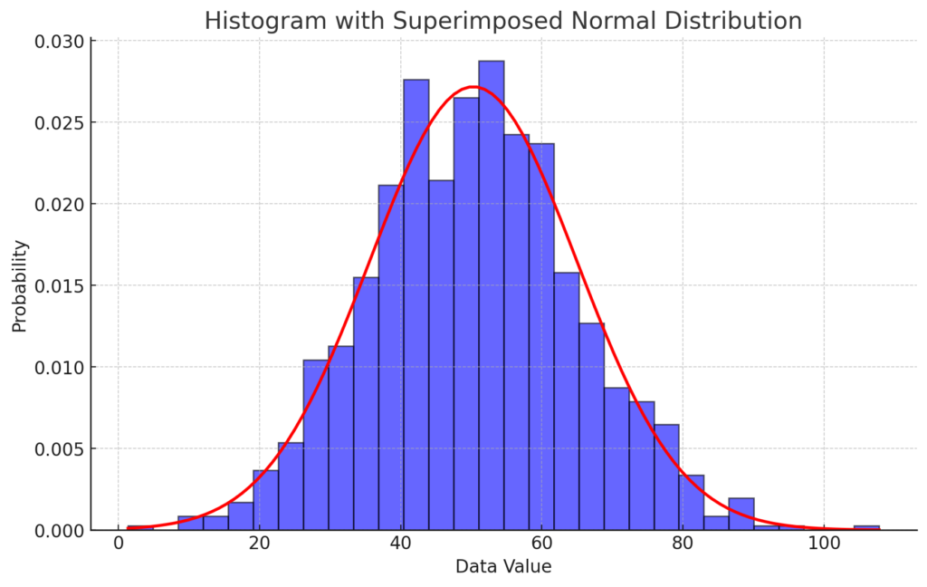 - If the histogram closely follows the red normal curve, the dataset is approximately normal.