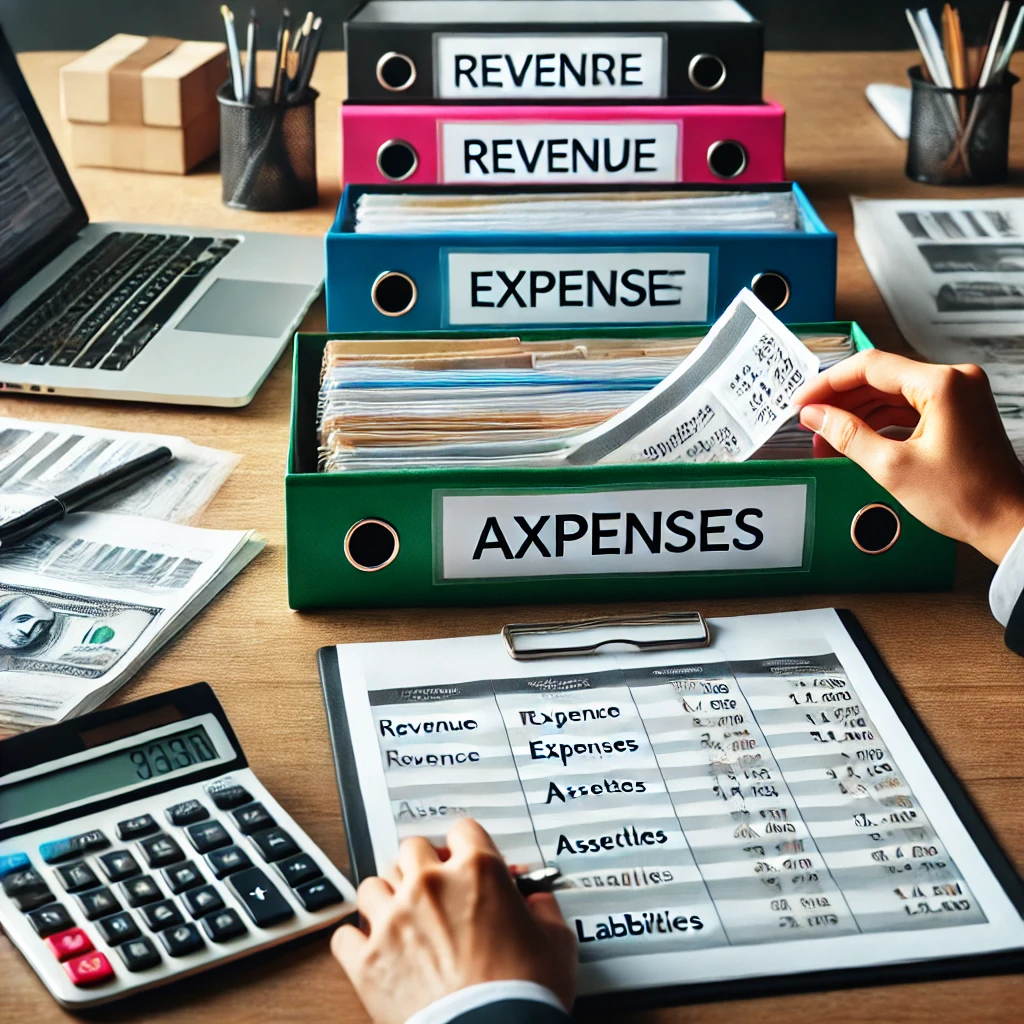 Here is an image illustrating a bookkeeper categorizing financial transactions into different folders labeled “Revenue,” “Expenses,” “Assets,” and “Liabilities.” Let me know if you need any modifications or further explanations!