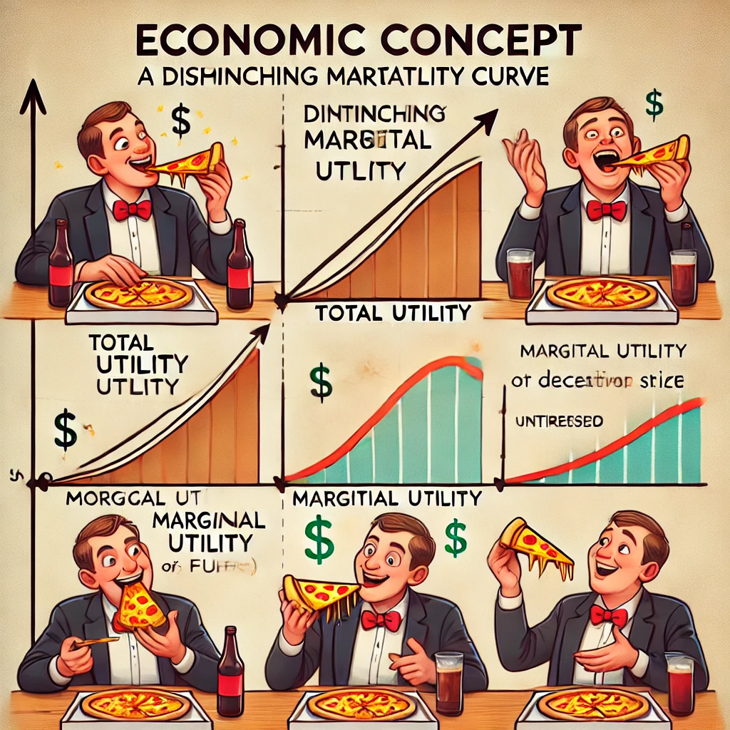 I’ve provided an image illustrating the concept of diminishing marginal utility, featuring a graph and a visual representation of a person enjoying pizza with decreasing enthusiasm. Let me know if you need any modifications or further explanations!