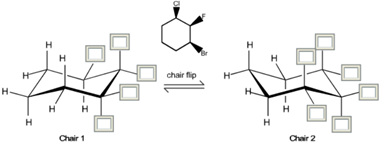 • Chair 1 Stability: If Br and Cl are equatorial, this conformation is more stable.